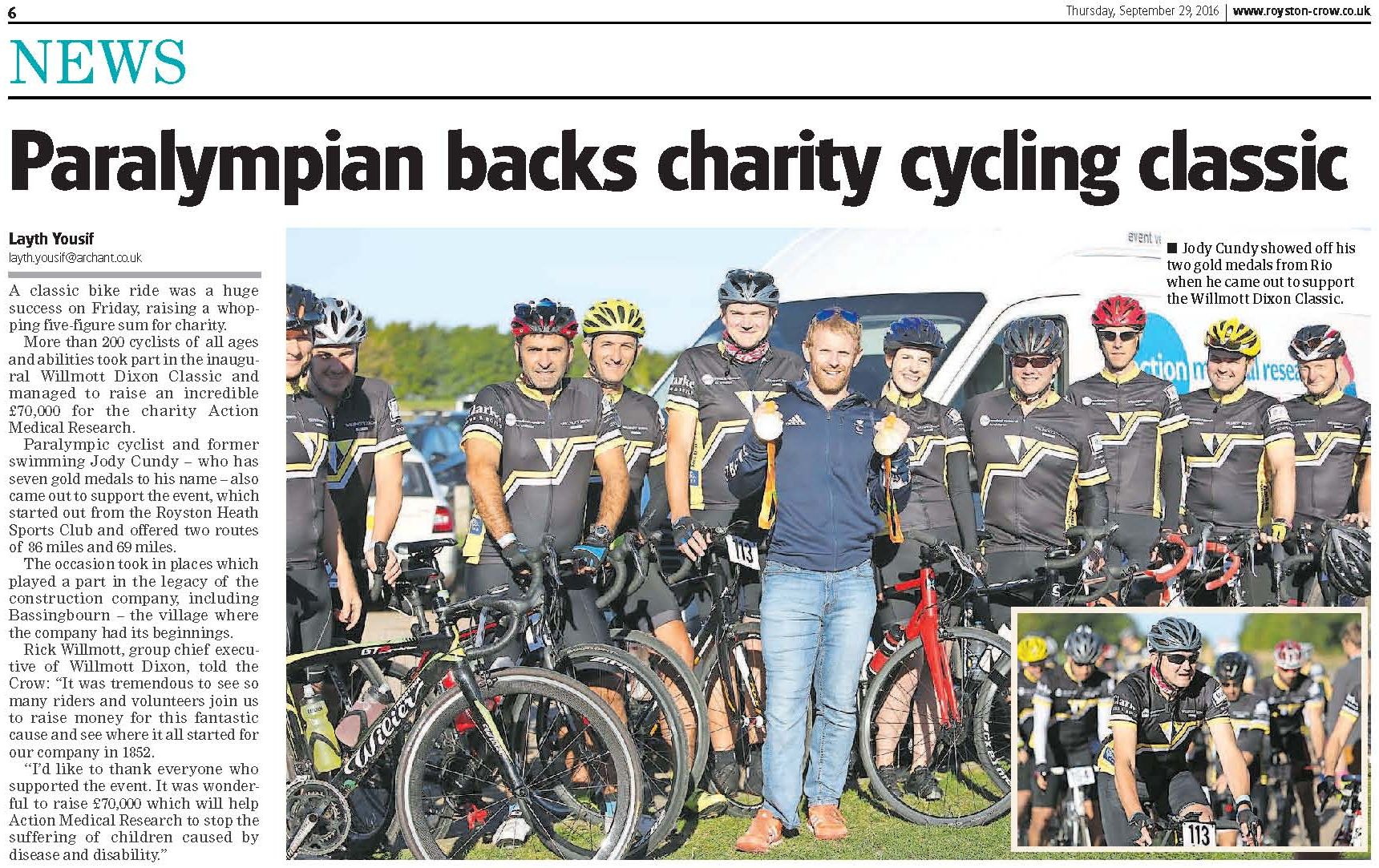 Just a week after landing back from Rio, Paralympian gold medallist Jody Cundy was in Hertfordshire to start off nearly 200 cyclists as they raised over £70,000 on the inaugural Willmott Dixon Classic.
