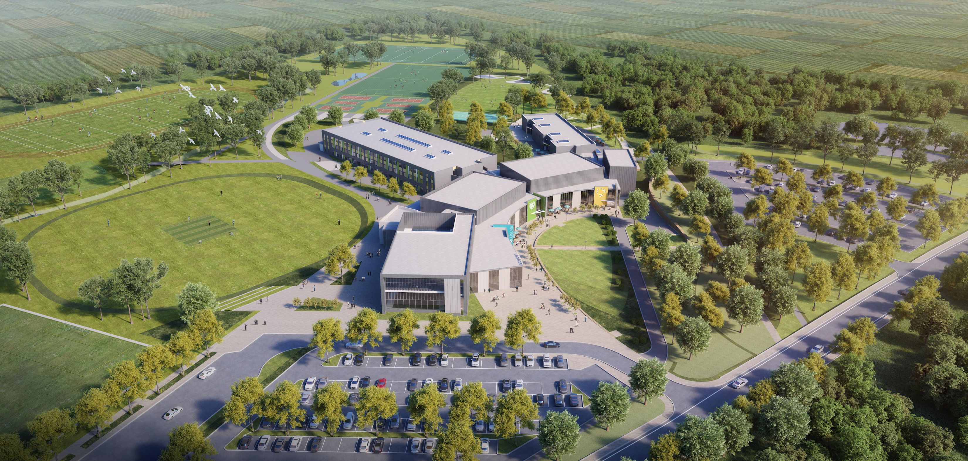 The adjoining leisure facility will provide a 25m six lane swimming pool, learner pool and children’s wet play area, a clip and climb and soft play area, fitness suite, studios, sports hall, badminton courts, outdoor sports fields, as well as two full size 3G pitches and a library.