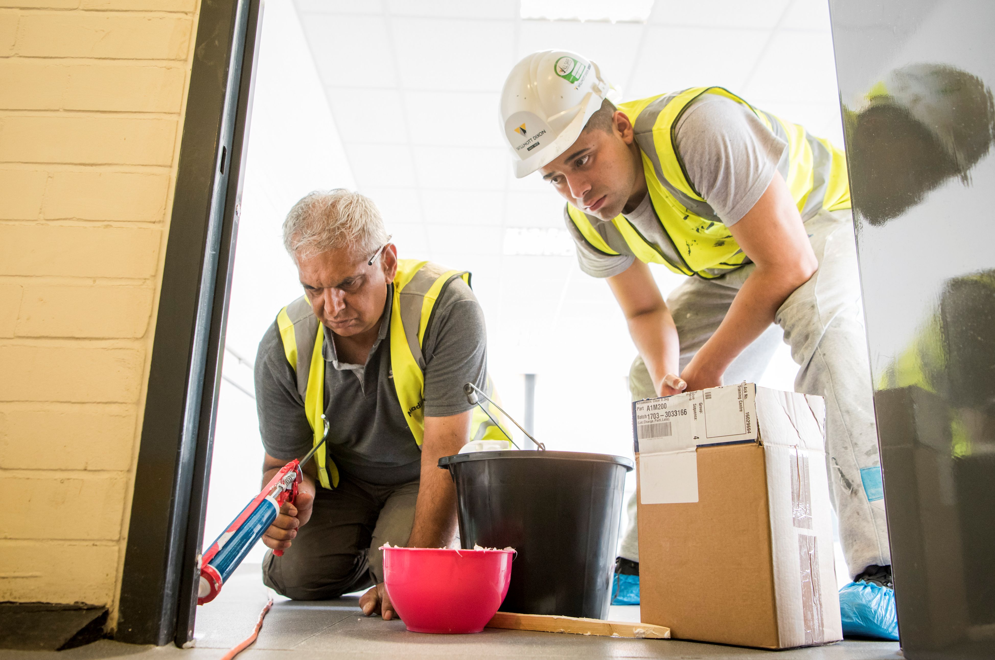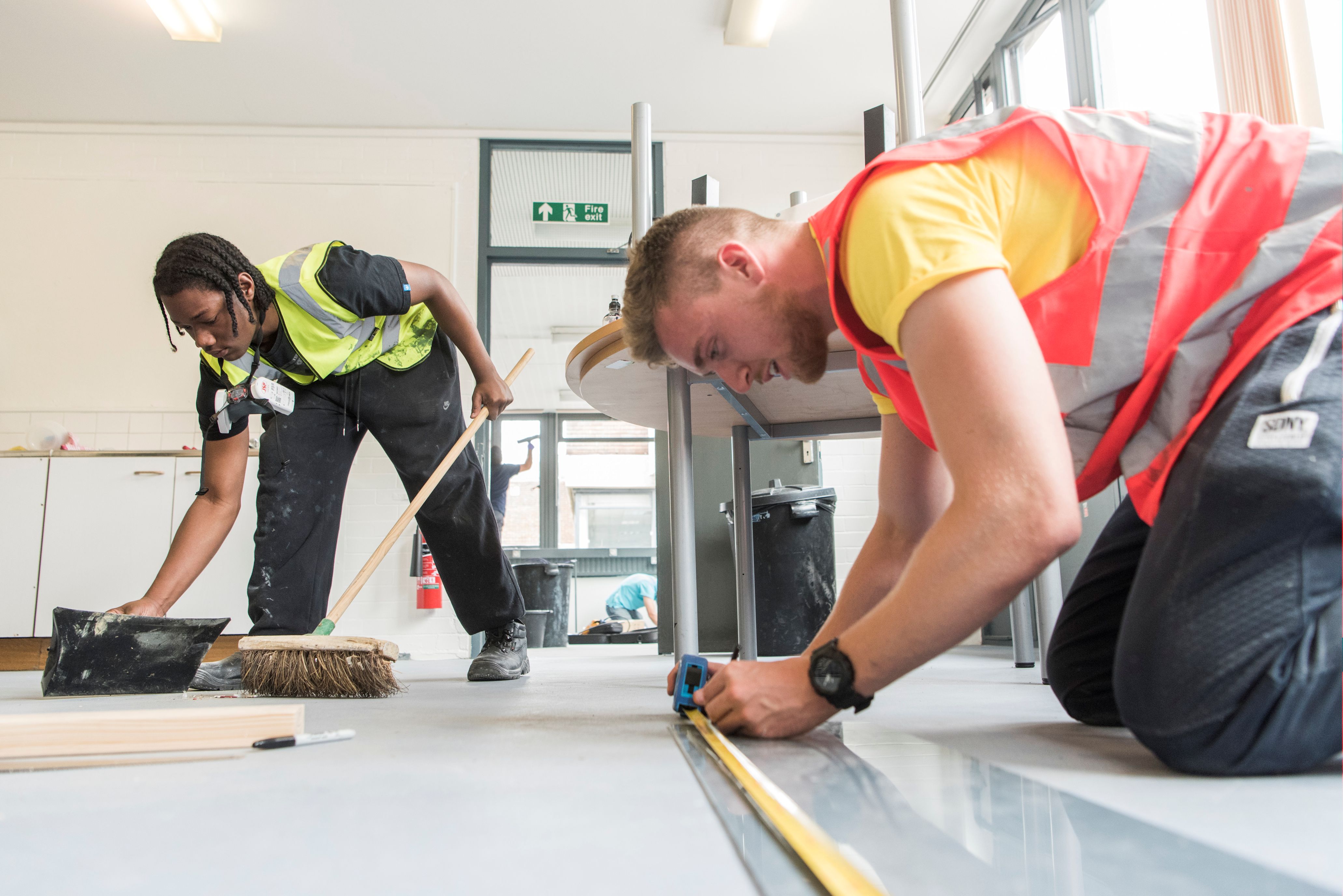 The two week intensive project saw the trainees and students undertake a ‘Ground Force’ style makeover that included new kitchen and workspace, Wi-Fi access, decoration, refit of the classrooms and new lighting and ceilings. They also added new vinyl flooring, equipped the upstairs classrooms that had no power with a new electrical circuit and created mock booths for a new employability hub that allows mock CSCS card examinations.