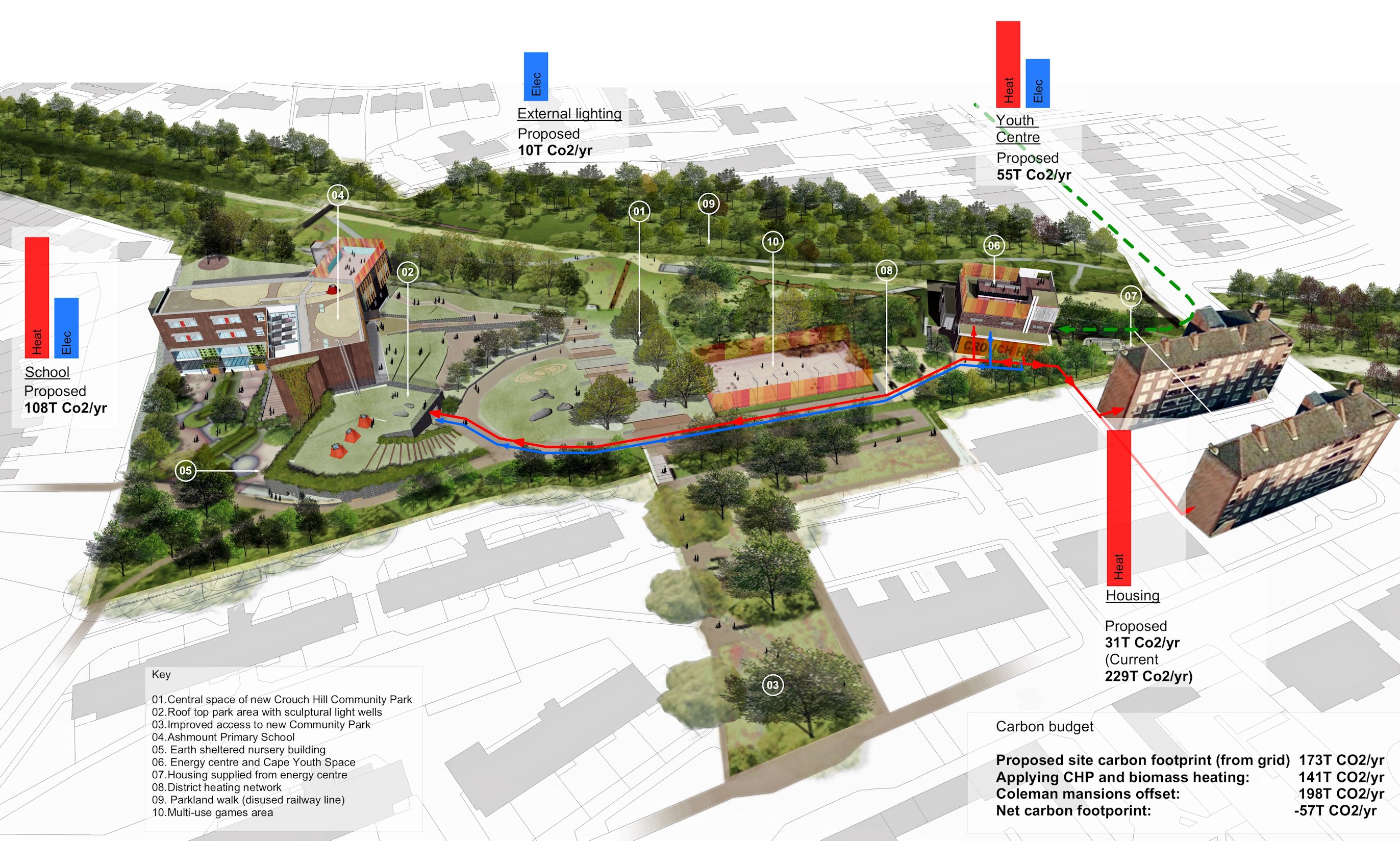 The scheme is zero carbon thanks to combined use of Combined Heat and Power (CHP) plant and a 495kW biomass boiler, housed in the Energy Centre. Base heating provided by CHP and biomass with CHP also meeting electrical demands of the park lighting. Excess heat from CHP (70kWe, 104kWth) is delivered off site to neighbouring dwellings thus offsetting the site’s own carbon footprint.