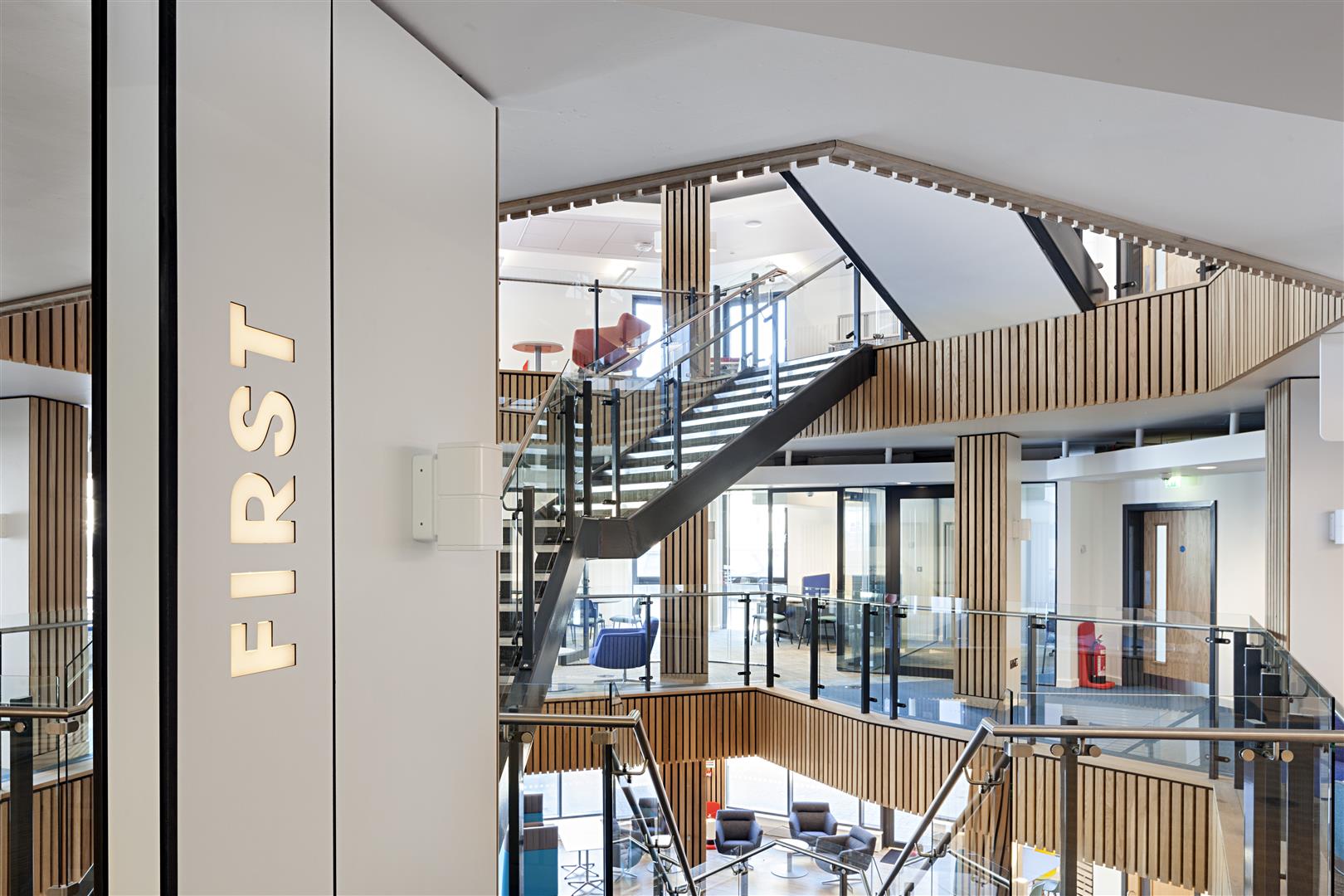 The new Student Centre is an important milestone in BU’s ongoing investment in world class facilities, improving the student experience for thousands. Striking in appearance, the hexagonal-shaped structure features a steel staircase within an atrium and a mixture of curtain walling and zinc cladding externally.