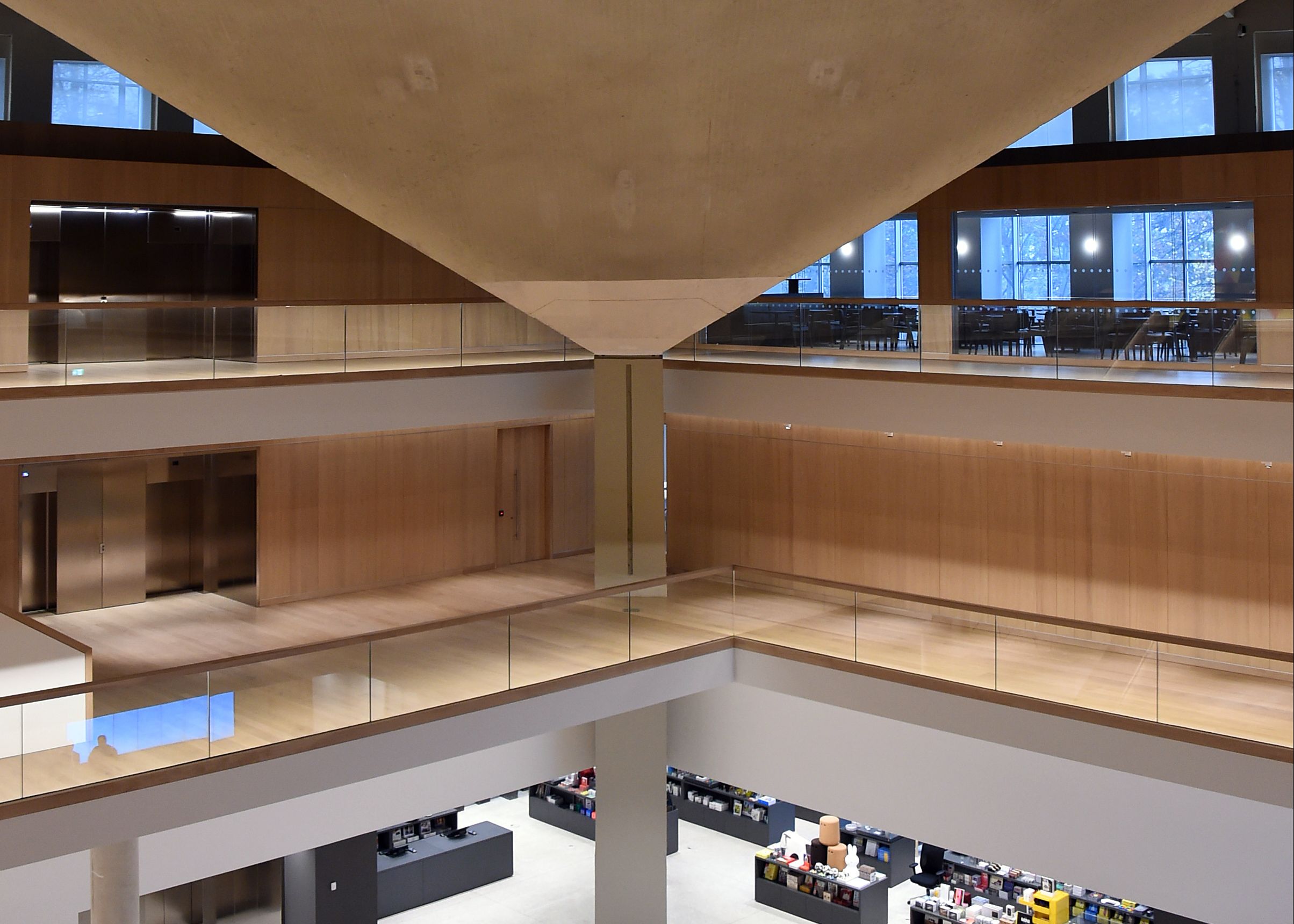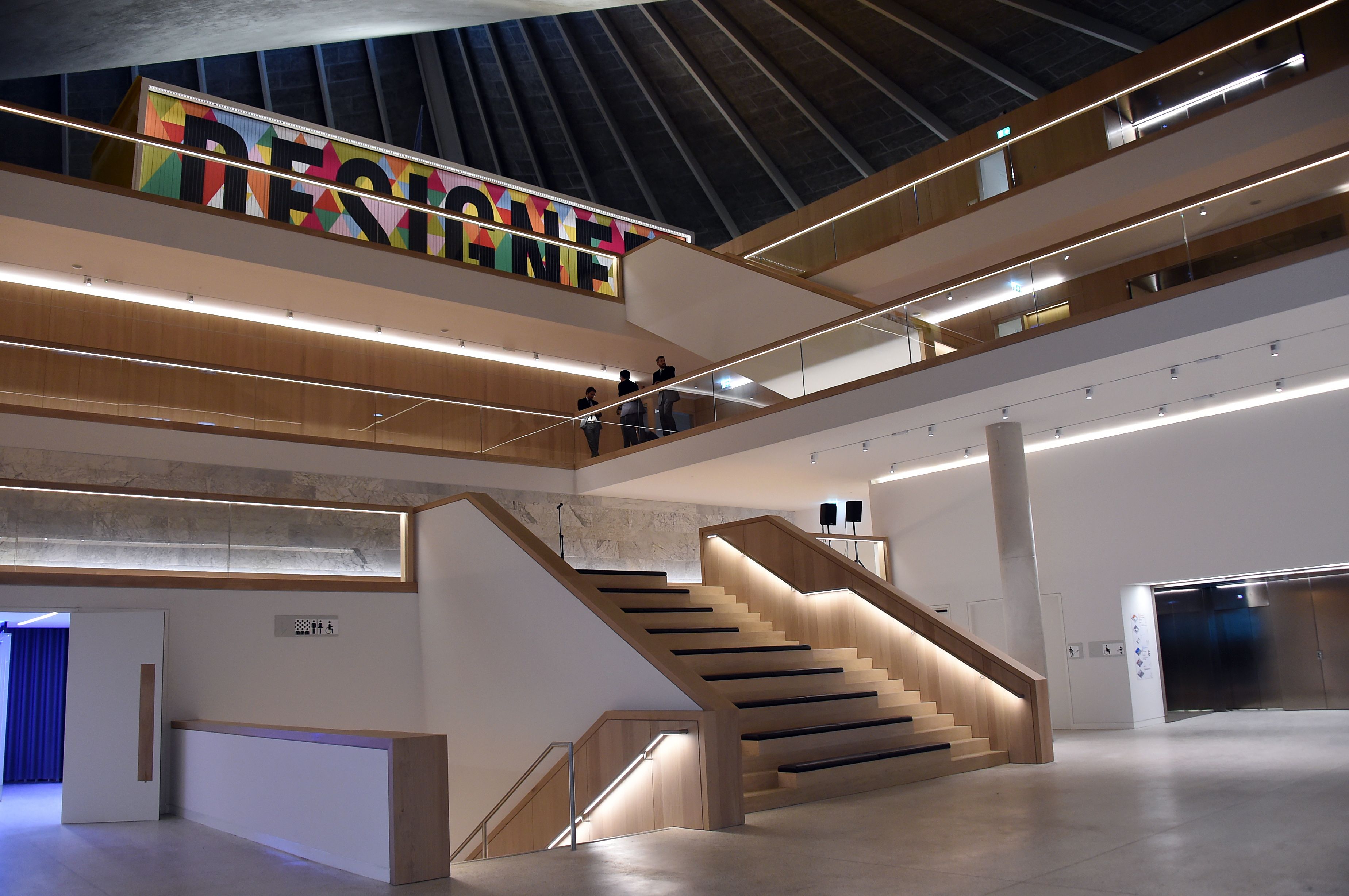 The museum features an open atrium, with large staircases around its edge, that allows for great views of its complex hyperbolic paraboloid roof.
