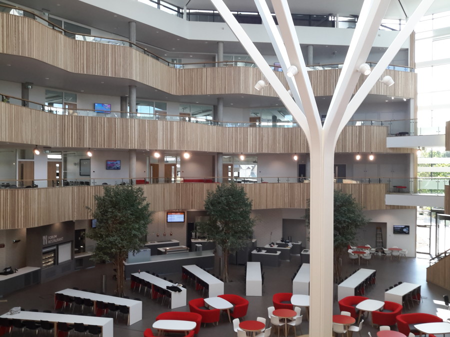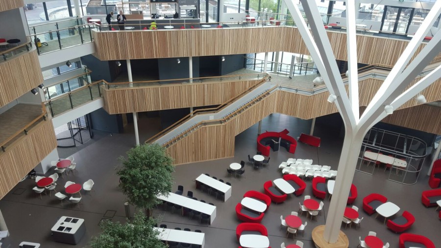 The four storey Fusion brings to nearly £40m the investment in the campus. Like the Student Centre, it was procured via Scape and local spend was key with 62% of the budget spent on firms within a 40-mile radius of the campus.