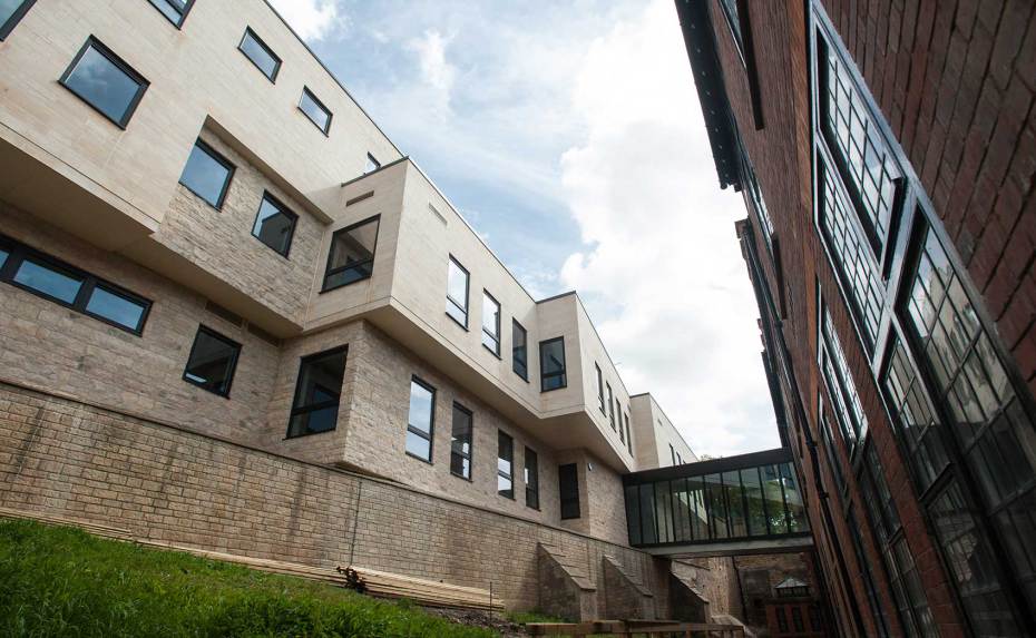 Also, it was set on a sloping site, with the new steel-framed building requiring excavation of 2,500 m3 of spoil to form a partial basement. It is clad in Ancaster Limestone (from Grantham), with a roof divided into seven roofs – to look like separate buildings from above – and part covered in Turncoat Steel to mimic lead.
