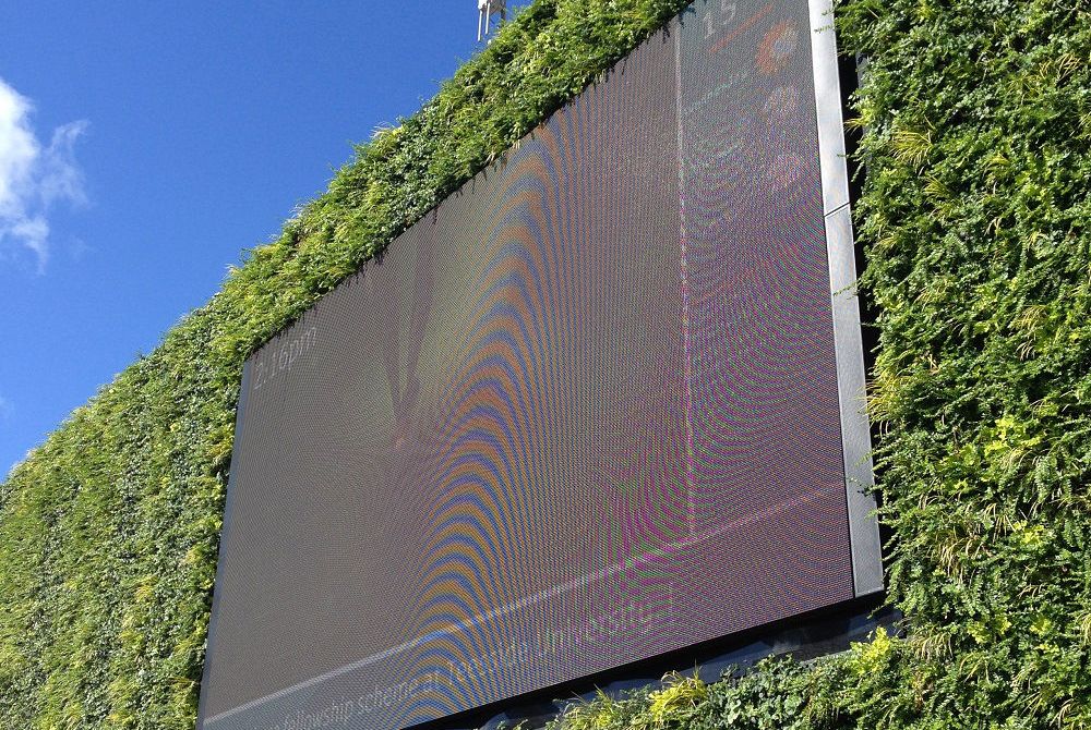 The vertical garden is at the rear of the Student Centre and provides a major focus to the redeveloped campus, with the wall's giant LED screen providing information on events at the University. It was carefully grown off-site before being carefully positioned as a thriving natural habitat at the centre of campus.